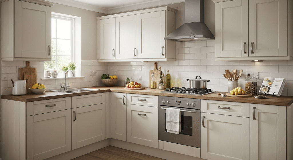 Scandinavian design uses light colours, clean lines, and simple shapes. This style feels fresh and warm without needing expensive materials. It tops many lists of low cost simple kitchen designs for its easy, practical look. Rapid Kitchen fits Scandi-style kitchens with affordable doors, plain handles, and neat storage. Our team makes sure the design stays light and useful, giving your home a calm, welcoming feel on a small budget.