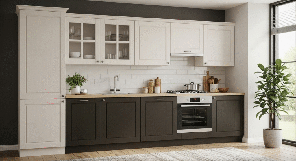 Two-tone cabinets mix two colours, for example light wall cabinets and darker base units. This contrast gives a smart, designer look without expensive fixtures. Two-tone kitchens are great low cost simple kitchen designs because a small change in colour creates big visual impact. Rapid Kitchen helps you pick colours that match your room and budget. Installation is simple and the kitchen looks modern and fresh.