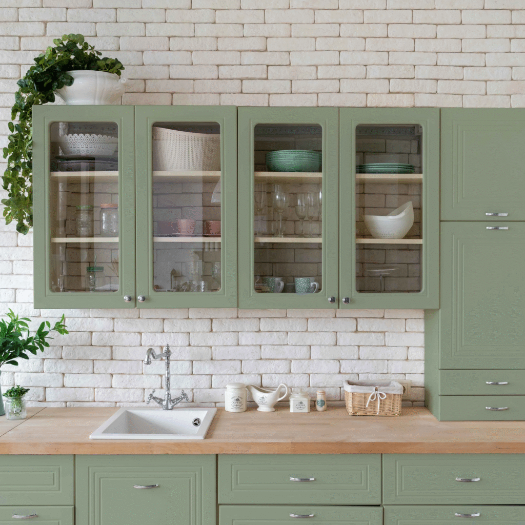 Seafoam green is a fresh and soft colour, perfect for a light and breezy kitchen. It’s very popular in Scandinavian-style designs because it blends easily with white, light wood, and open shelves. This kind of pastel coloured kitchen makes your home feel clean, simple, and modern.