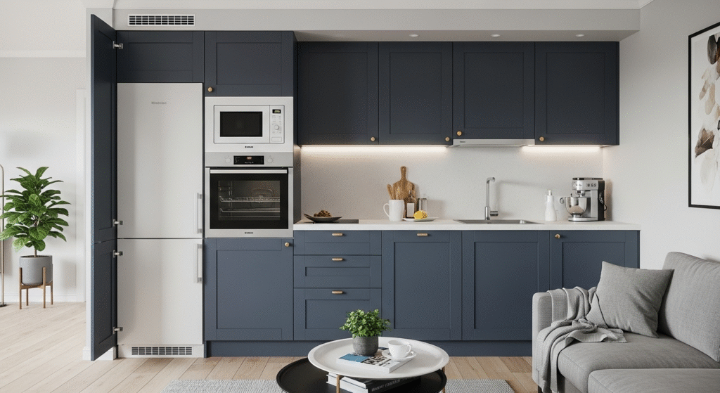 Integrated appliances make a small living room kitchen combo look clean and modern. Fridges, ovens, and microwaves that fit inside cabinets keep your kitchen tidy and uncluttered. With hidden appliances, the kitchen flows smoothly into the living area, creating a calm and organized space. Rapid Kitchen offers fully integrated appliances with every kitchen design. Our specialists choose the right sizes and positions to save space while keeping your kitchen functional. The result is a kitchen that feels bigger, stylish, and ready for daily use.